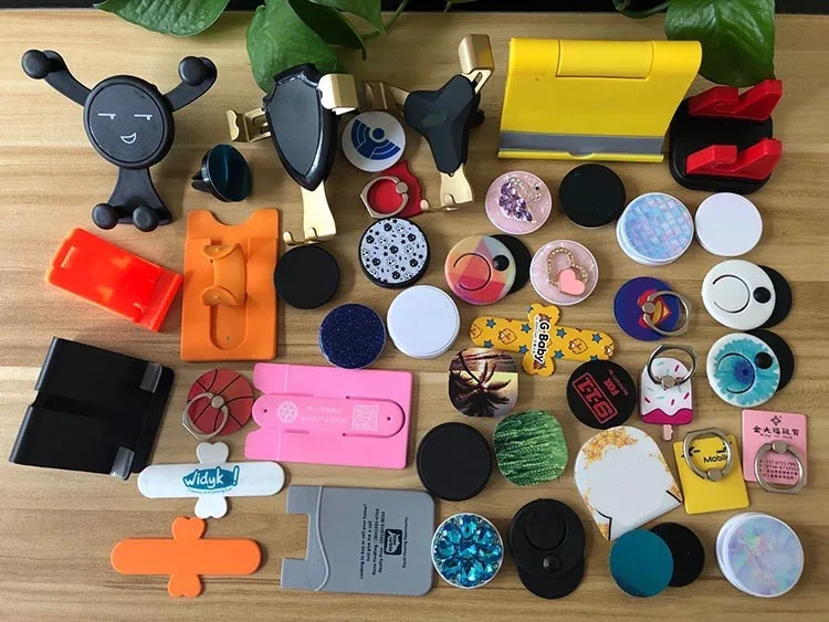 also have Car phone holder, silicone card phone holder, folding Phone holder, Acrylic Phone holder, Rubber Phone Holder, Metal Desk phone holder, Kinds of Ring Phone Holders. all can be with custom logo or text print, Low MOQ.