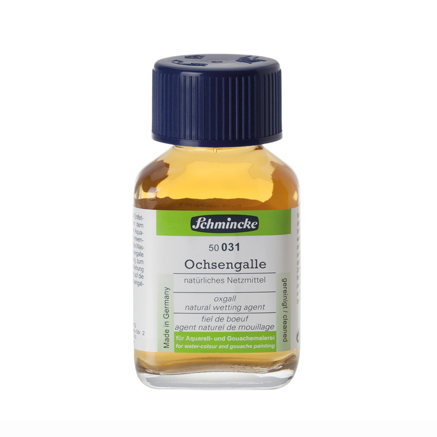 Разбавитель Schmincke бычья желчь улучшает текучесть и прозрачность акварельных красок. Натуральный смачивающий агент для акварельных красок и гуаши. Уменьшает поверхностное натяжение красок, повышает цветопередачу и способствует лучшему закреплению красок на поверхности. Небольшое количество желчи, добавленной к акварели, предотвращает размытие красок и изменение тона, способствует их равномерному распределению. Стеклянный флакон 60 мл.
