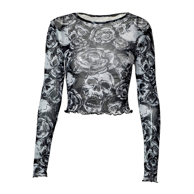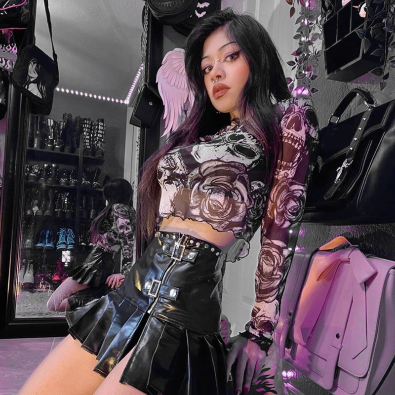 Темно-готический стиль, принт с черепами и розами, гофрированная отделка на манжетах и подоле.