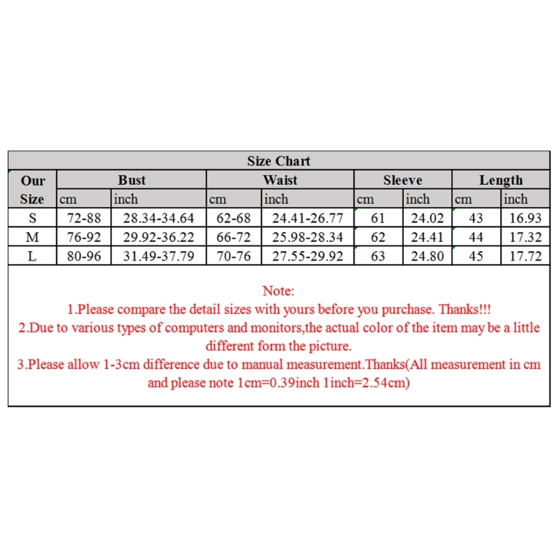Размер: S Обхват груди: 72-88 см (28,34-34,64 дюйма) обхват талии: 62-68 см (24,41-26,77 дюйма) рукав: 61 см (24,01 дюйма) длина: 43 см (16,92 дюйма)
