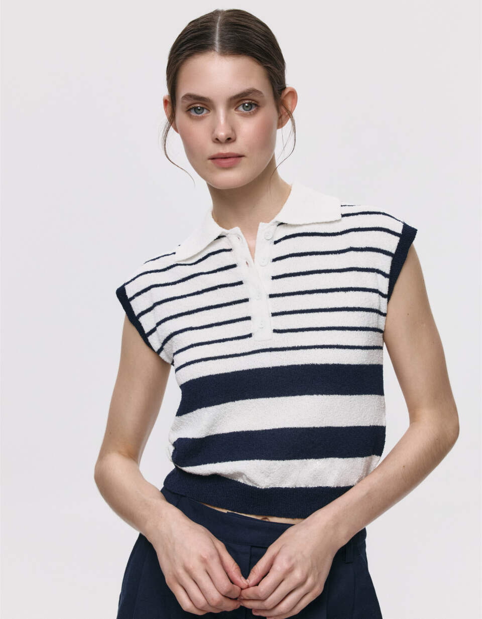 Вязаный топ в полоску с воротником