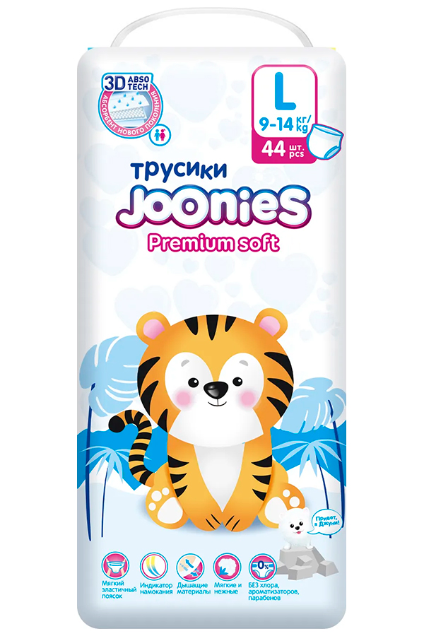 Подгузники-трусики Joonies Premium Soft размер L (9-14 кг), 44 шт Подгузники-трусики Joonies Premium Soft размер L (9-14 кг), 44 шт