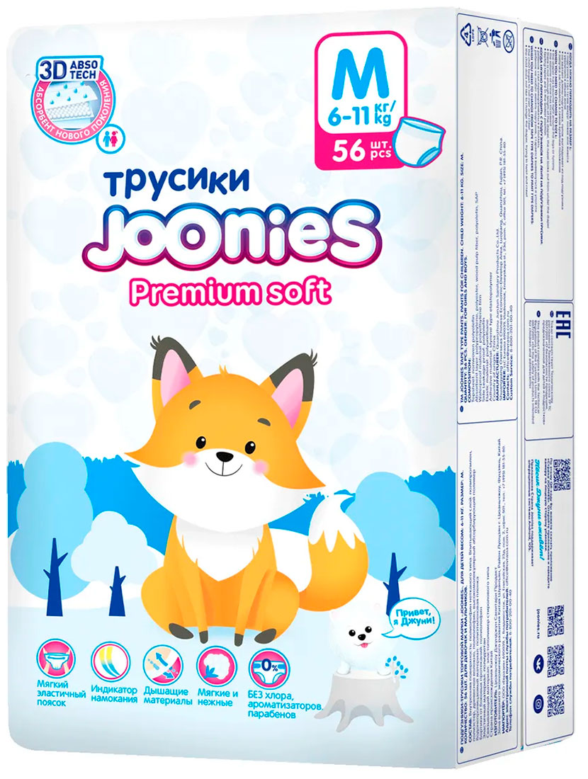 Подгузники-трусики Joonies Premium Soft размер M (6-11 кг) 56 шт. Подгузники-трусики Joonies Premium Soft размер M (6-11 кг) 56 шт.
