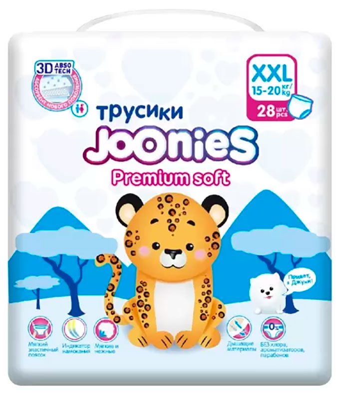 Подгузники-трусики Joonies Premium Soft размер XXL (15-20 кг) 28 шт. Подгузники-трусики Joonies Premium Soft размер XXL (15-20 кг) 28 шт.