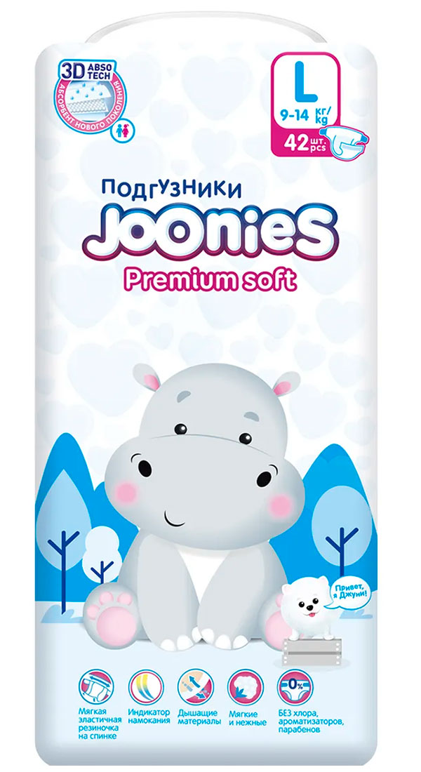 Подгузники Joonies Premium Soft размер L (9-14 кг) 42 шт. Подгузники Joonies Premium Soft размер L (9-14 кг) 42 шт.