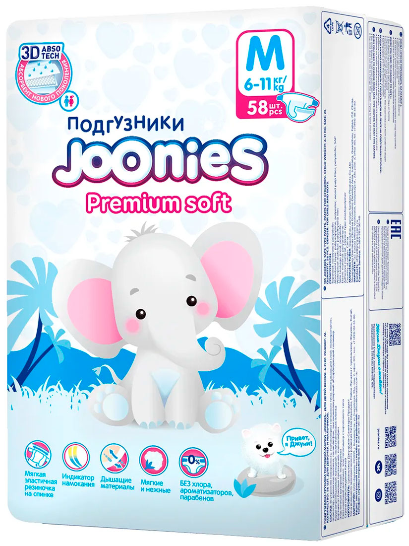 Подгузники Joonies Premium Soft размер M (6-11 кг) 58 шт. Подгузники Joonies Premium Soft размер M (6-11 кг) 58 шт.