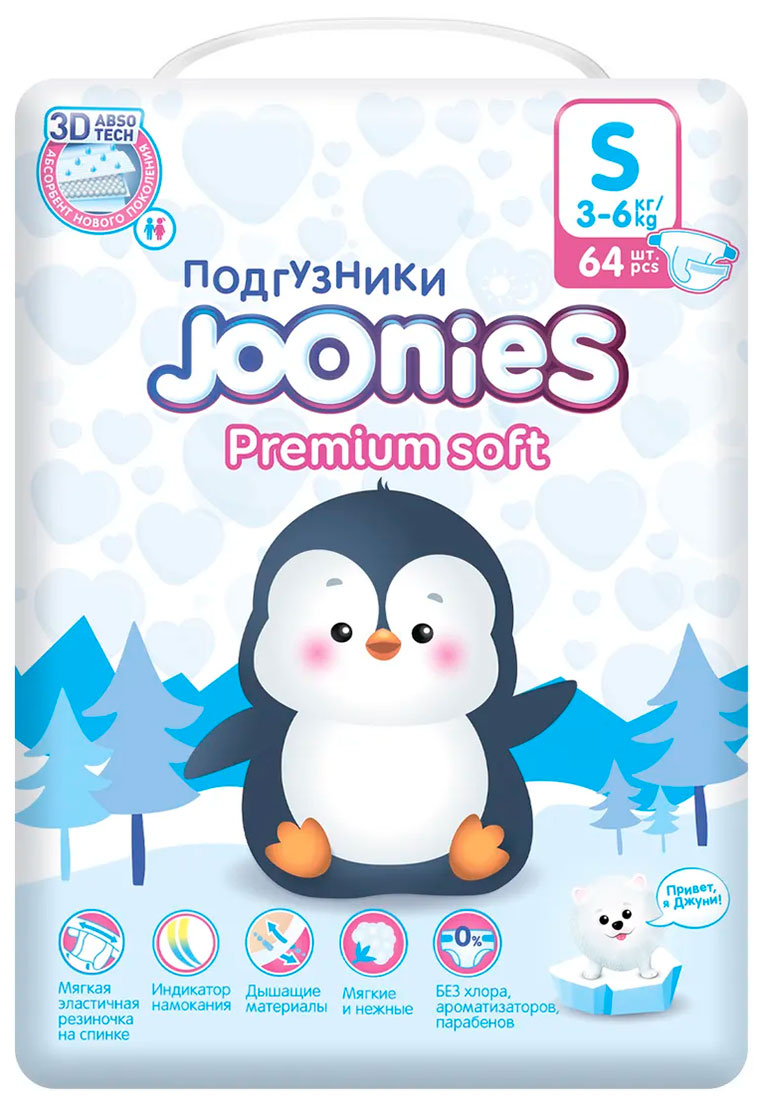 Подгузники Joonies Premium Soft размер S (3-6 кг) 64 шт. Подгузники Joonies Premium Soft размер S (3-6 кг) 64 шт.