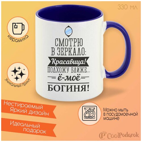 Кружка синий CoolPodarok Смотрю в зеркало Красавица, подхожу ближе, ё мое. богиня