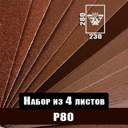 Наждачная бумага, шкурка шлифовальная, водостойкая, БАЗ 3М, набор из 4 листов (Р80) 230х280мм