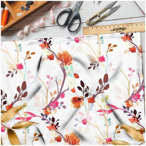Ткань габардин акварельные веточки и лепестки (Габардин)