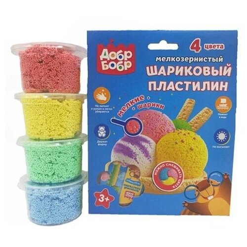 Набор шарикового мелкозернистого пластилина без блесток ДобрБобр, 4 цвета, 500 мл