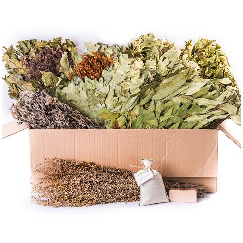 Набор веников для бани Ассорти / 6 веников в картонной коробке / Дубовый, Березовый, Кленовый, Лиовый, Эвкалиптовый, Канадский дуб
