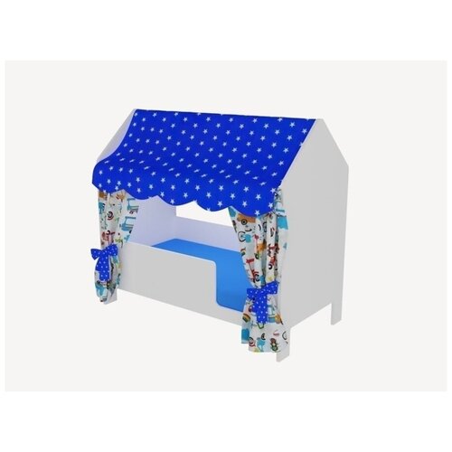 Кровать детская домик с текстилем (синий, с машинками, вход справа) "Базовый"