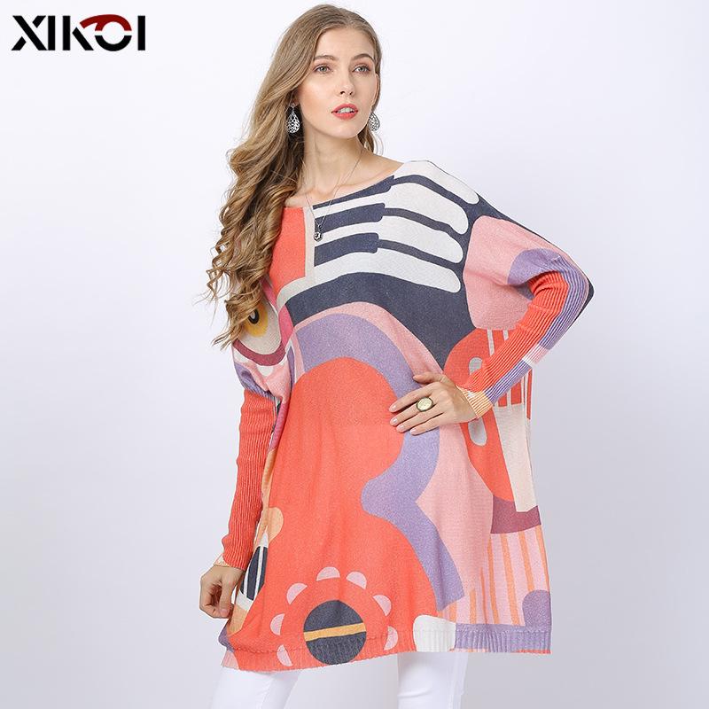 XIKOI Европа и Америка Свободный плюс Размер Трикотаж Женская нота Печать Воротник с длинным рукавом Пуловер