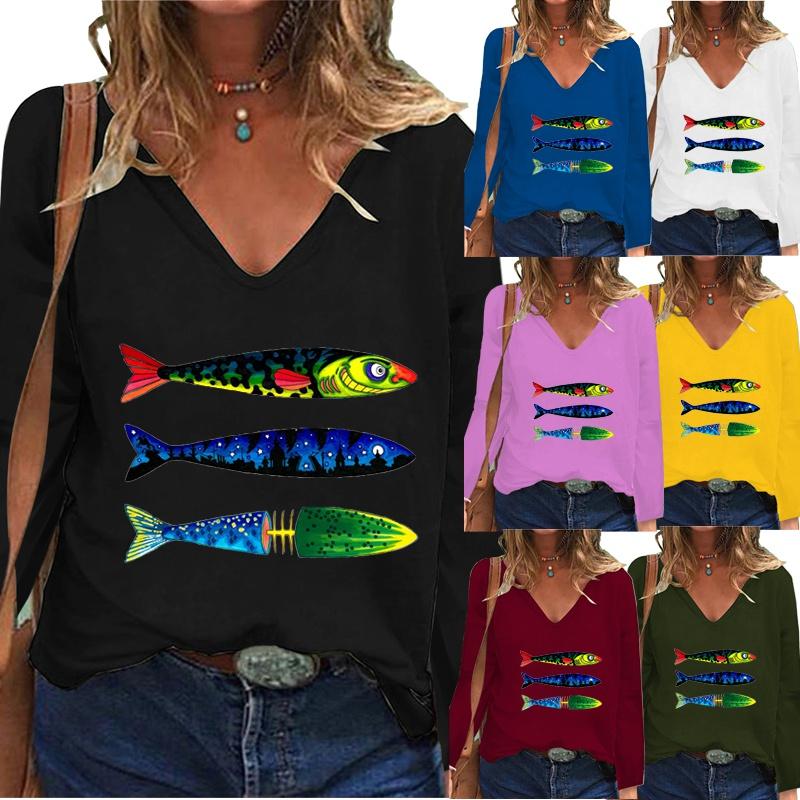 2021 Осень Женская рыба с длинным рукавом V-образный вырез Футболка Повседневная свободная блузка Топы Плюс Размер XS-5XL