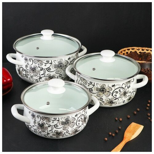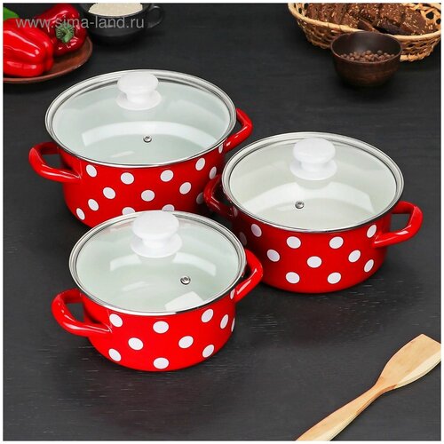 Набор кастрюль эмалированных со стеклянной крышкой " Белый горох-1-Люкс" 1,9л + 2,5л + 3,7л