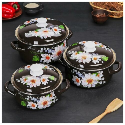 Набор кастрюль «Белые георгины», 3 предмета: 2 л, 3 л, 4 л, индукция, цвет коричневый