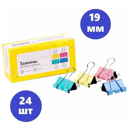 Зажимы для бумаг 19мм, 24шт., цветные, картонная коробка
