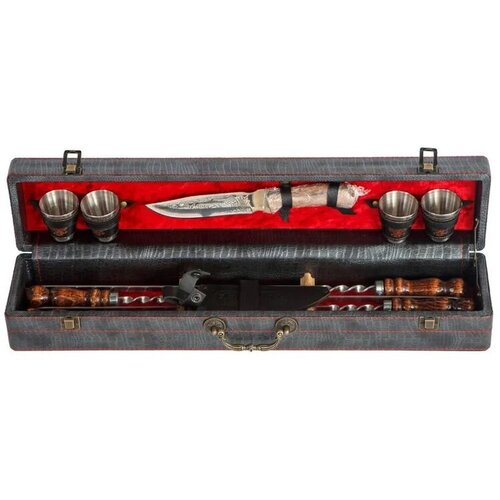 Набор шампуров подарочный в кейсе №5: Шампур-4 шт; Нож с чехлом-1 шт; Рюмки-4 шт; Кейс-1 шт