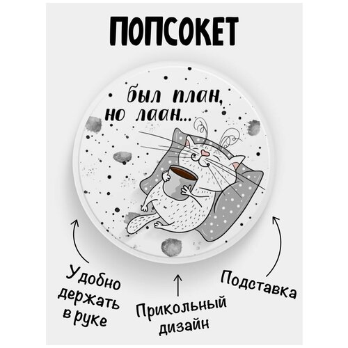 Держатель для телефона белый цвет "Попсокет" Был план, но лан. Сувенир с рисунком из акрила на подарок. Презент на работу коллеге