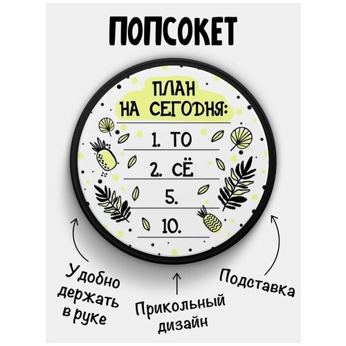 Держатель для телефона черный цвет "Попсокет" с надписью План на сегодня: 1. то, 2. се, 5. 10. Сувенир с рисунком из акрила на подарок