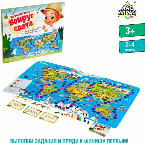 Настольная игра-бродилка Путешествие вокруг света, набор пластиковых животных, карточки