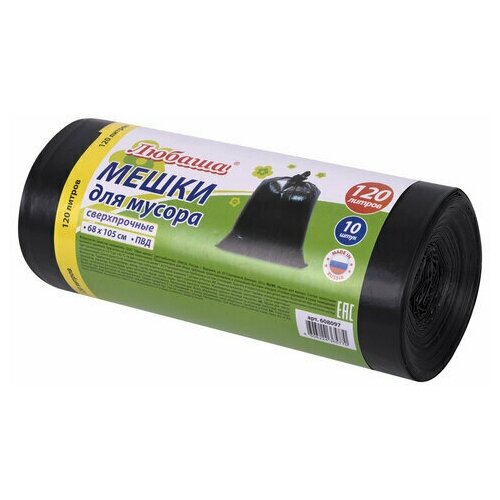 Мешки для мусора 120 л, черные, в рулоне 10 шт., ПВД 30 мкм, 65х100 см, любаша, 608096