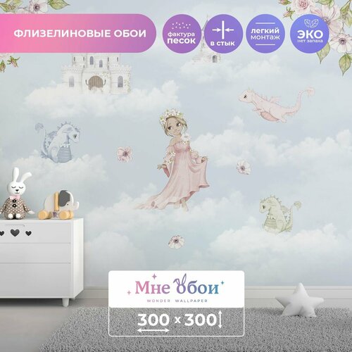 Детские флизелиновые фотообои Принцесса с добрыми драконами в облаках 300х270 (ШхВ)