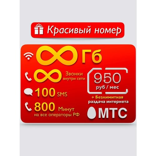 Сим карта МТС / Безлимитный интернет / Красивый номер / 950 руб/мес
