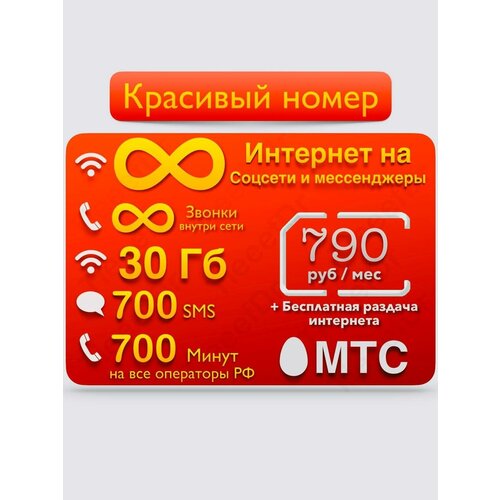 SIM-карта МТС, интернет на соцсети безлимитные, 700 минут, 700 СМС за 790 руб/мес Красивый номер