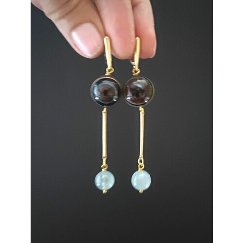 Длинные серьги пусеты с камнем агат черепаховый и аквамарин