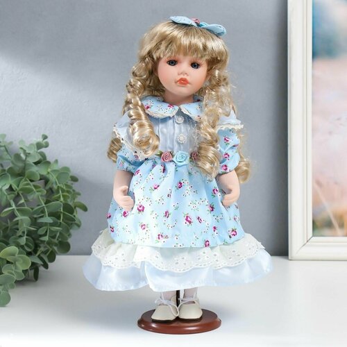 Кукла коллекционная керамика Тося в голубом платье с цветочками, с бантом в волосах 30 см