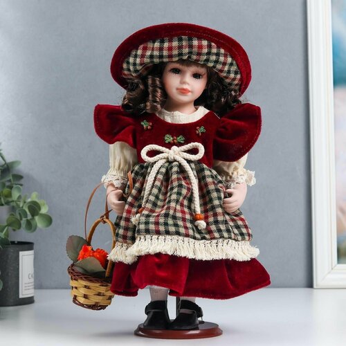 Кукла коллекционная керамика Марина в платье с бархатом в клетку, с корзиной 30 см