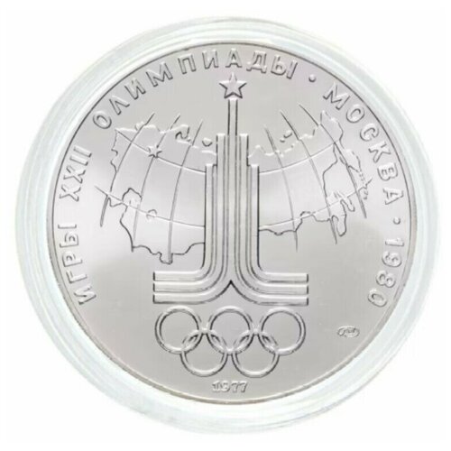 Серебряная монета 10 рублей 900 пробы в капсуле XXII Олимпиада 1980г в Москве - карта СССР, СССР, 1977 г. в. Состояние UNС (без обращения)
