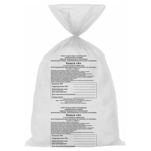 Пакет для мед.отходов кл.А белый 500х600х10мкм, 100 шт/уп, сзпи