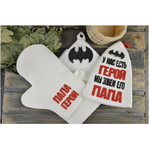 Набор банный с апплик."Папа ты герой" (шапка,рукавица,коврик) войлок НА001