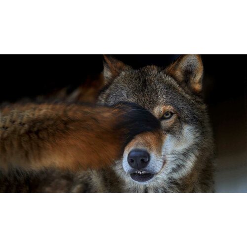 Картина на холсте 60x100 LinxOne "Волк закрывший хвост глаз" интерьер для дома / декор на стену / дизайн
