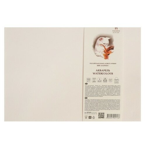 Бумага для акварели с хлопком 210х300, 5 листов, 100% хлопок, 200 г/м2, белая