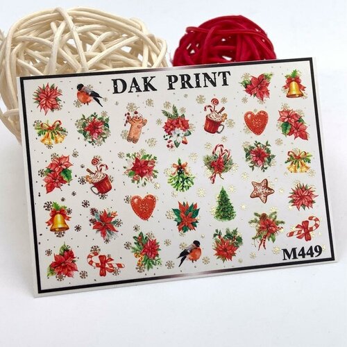 Металлизированные cлайдеры для маникюра (водные наклейки) для дизайна ногтей "Новогодний сет: елка, снегирь, колокольчики"