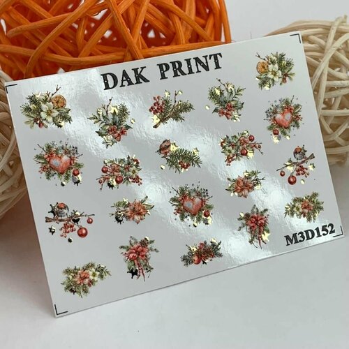 Металлизированные 3D cлайдеры для маникюра (водные наклейки) для дизайна ногтей "Еловые веточки, цветы и сердце"