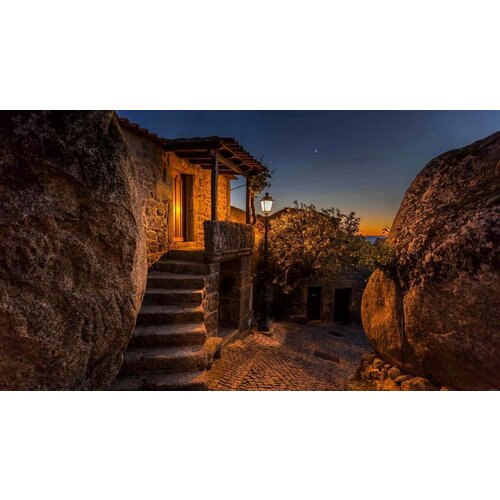 Картина на холсте 40x60 LinxOne "Дом фонарь двор рассвет камни" интерьер для дома / декор на стену / дизайн