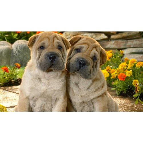 Постер на экокоже 60x100 LinxOne "Щенок двор цветы шарпей" интерьер для дома / декор на стену / дизайн