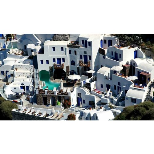 Постер на экокоже 60x60 LinxOne "Санторини двор бассейн Греция дома" интерьер для дома / декор на стену / дизайн