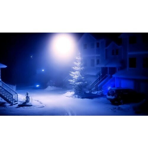 Постер на экокоже 60x80 LinxOne "Зима машина снеговик свет двор" интерьер для дома / декор на стену / дизайн