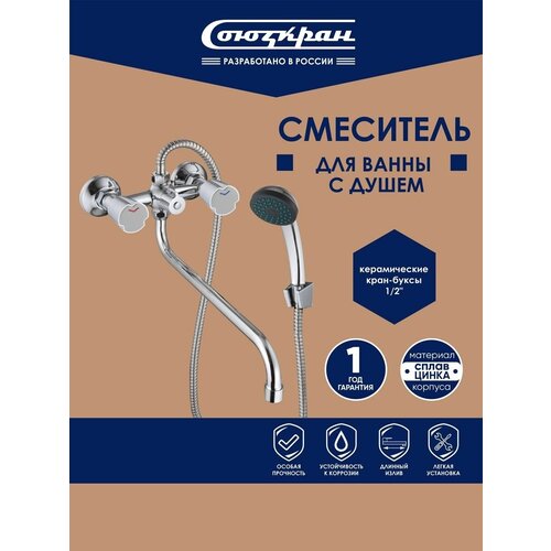 СоюзКран Смеситель д/ванны SK1082 (Zn), длинный излив, керам. дивертор, с душ. набором,35 мм, 567-029