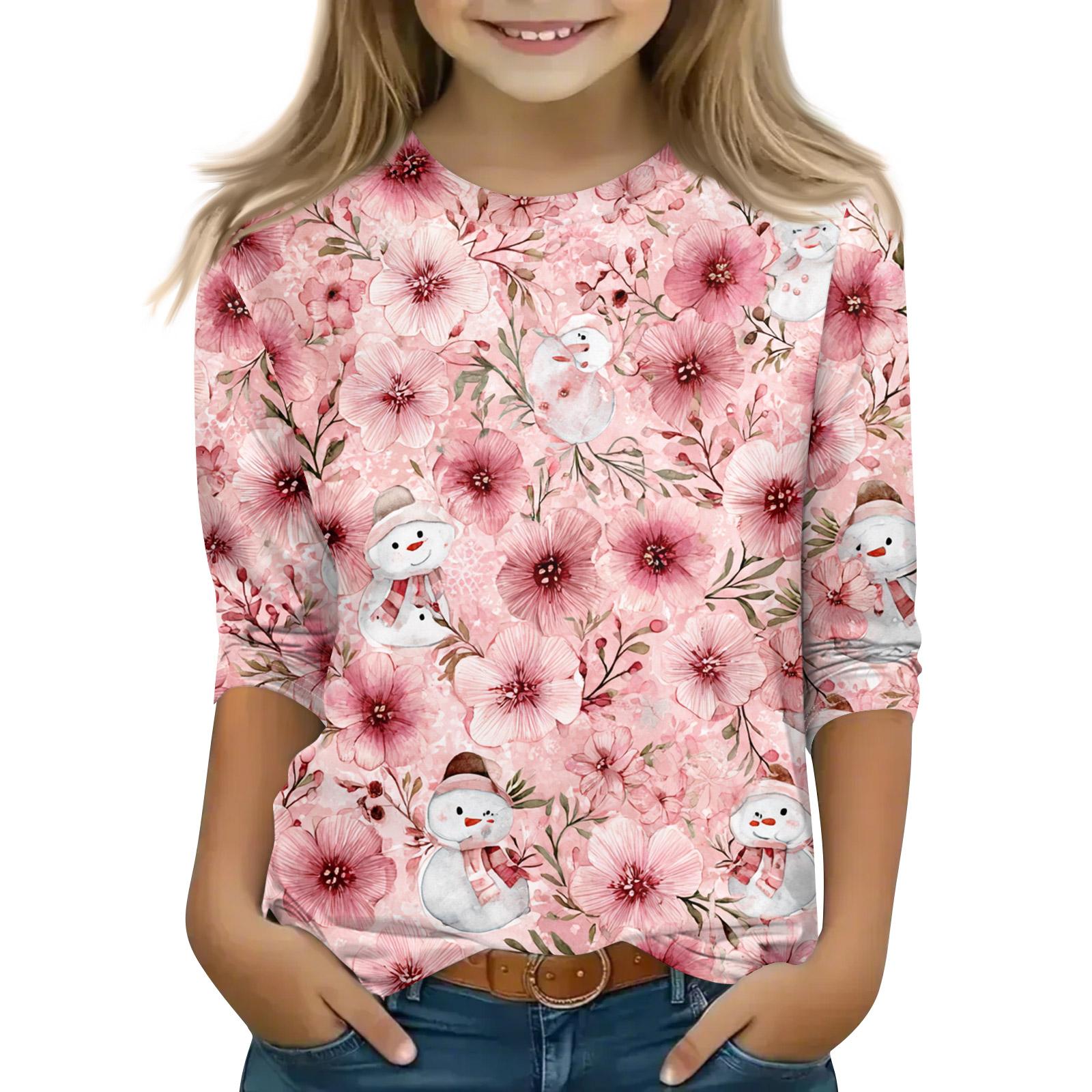 Рождественские топы с принтом для девочек-подростков 4-11 лет, футболки с круглым вырезом и рукавами 3/4, модные топы, нарядные футболки 160