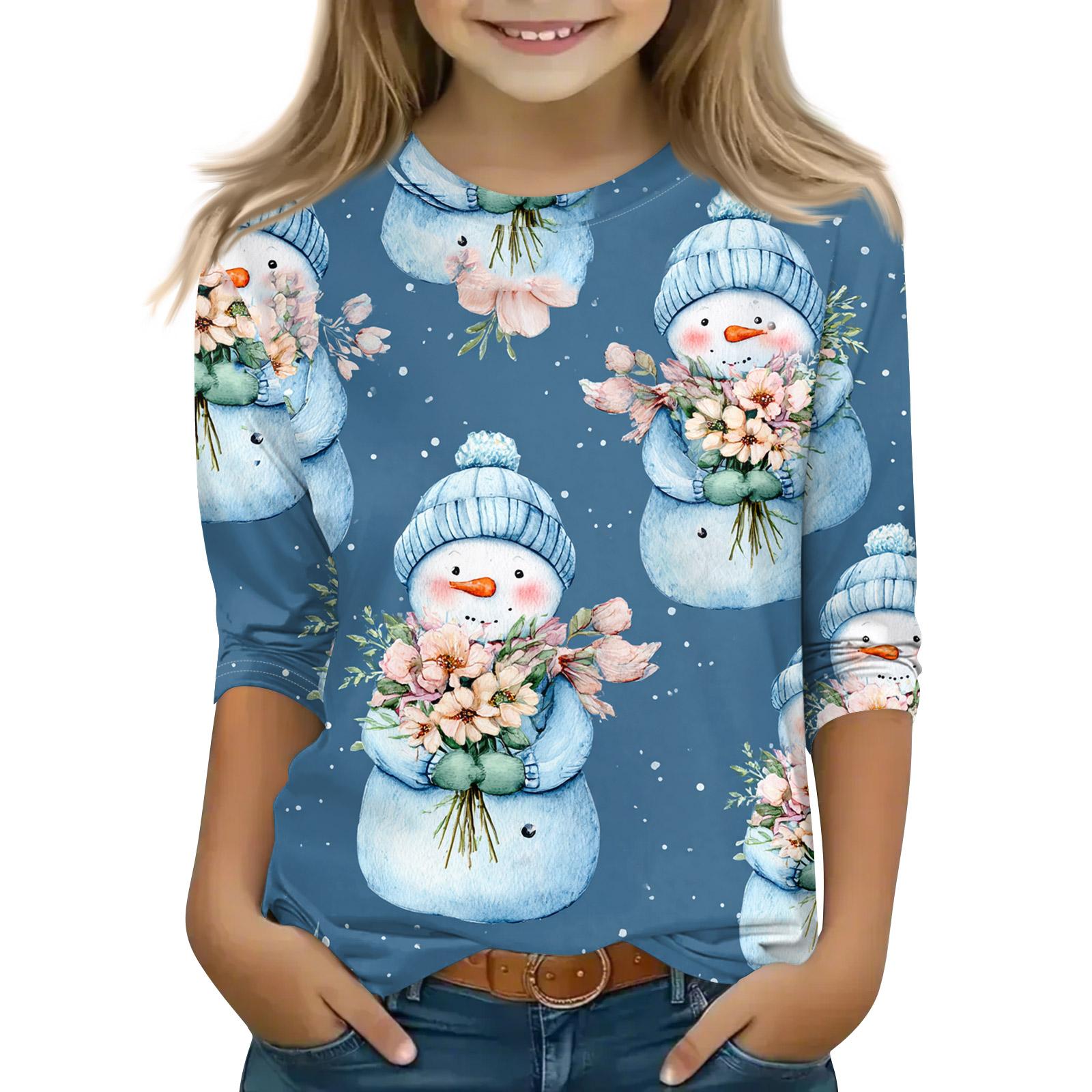 Рождественские топы с принтом для девочек-подростков 4-11 лет, футболки с круглым вырезом и рукавами 3/4, модные топы, нарядные футболки 110 синий