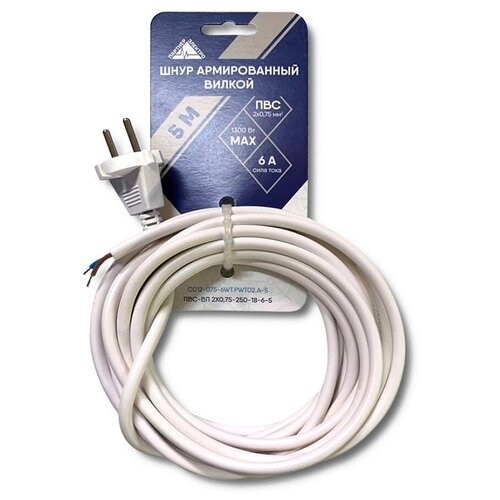 Шнур сетевой Партнер-Электро (ЦБ-00013567) без заземления 5,0 м 6 А 220-250 В 1,3 кВт ПВС-ВП 2х0,75 IP20 с вилкой белый