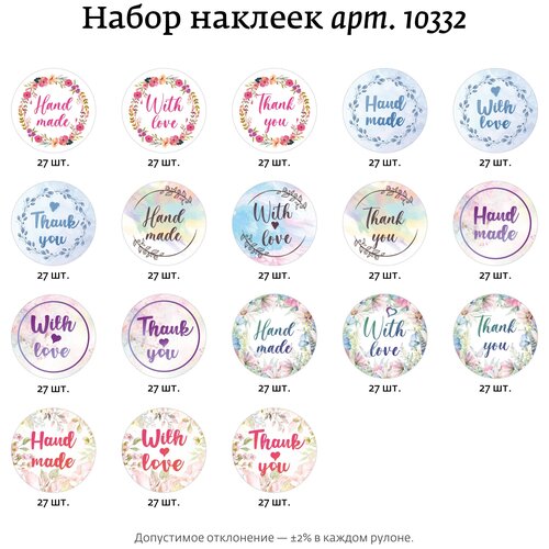 Набор наклеек 10332 Hand made, With love, Thank you, полипропиленовая пленка, диаметр 40 мм, 500 шт. Ювента. Маркет
