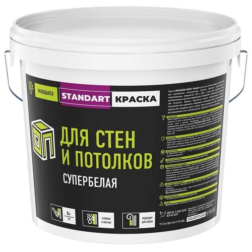 Краска для стен и потолков Ярославские краски Standart моющаяся цвет белый 9 л